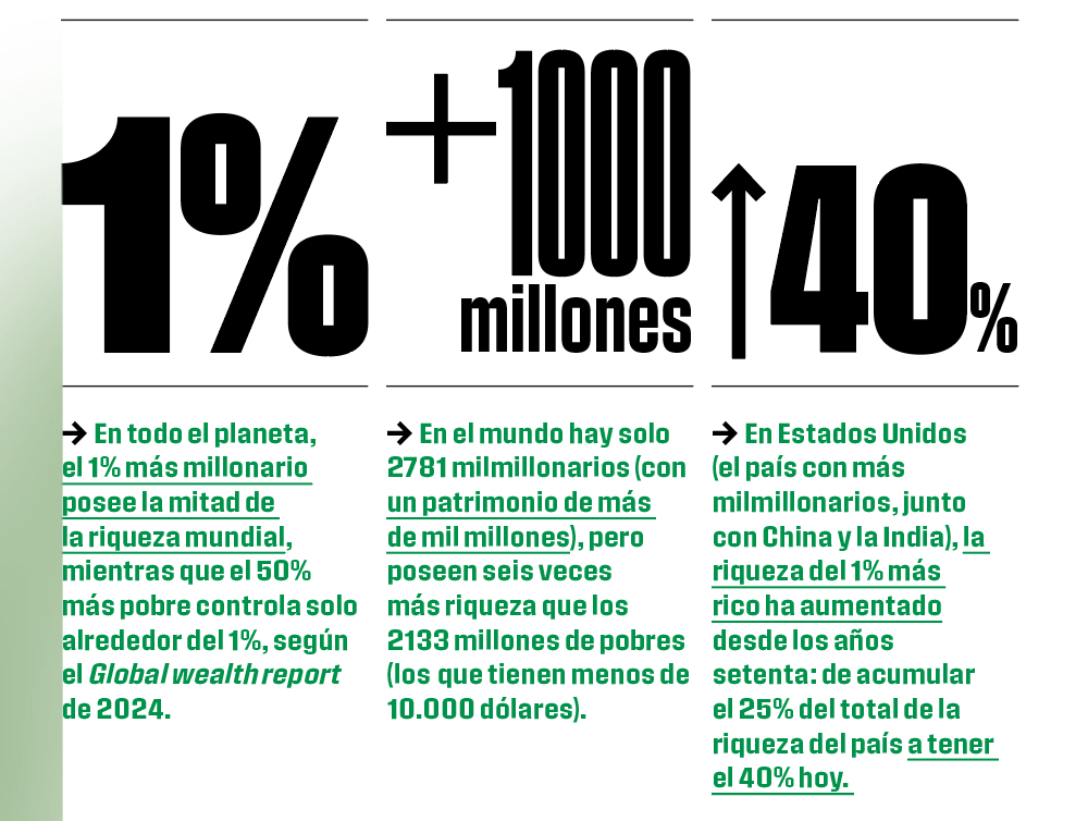 O.B. Sí, es cierto, podemos hacer cosas y se están haciendo. En Francia, el impuesto promovido por Gabriel Zucman ya se ha adoptado por la Asamblea y en un mes va a ir al Senado. Es un impuesto mínimo global sobre la riqueza de los milmillonarios. Propone computar dos impuestos, uno por los ingresos y otro por el patrimonio, y aplicas el más alto. La cuestión es qué tasa poner sobre la riqueza. Zucman dice que el 2 por ciento. Y mi sensación es que, si pones ese impuesto, muchos de esos multimillonarios se irán del país. Yo creo que el 1 por ciento es más razonable. Pero se pueden mover las cosas [véase el gráfico].